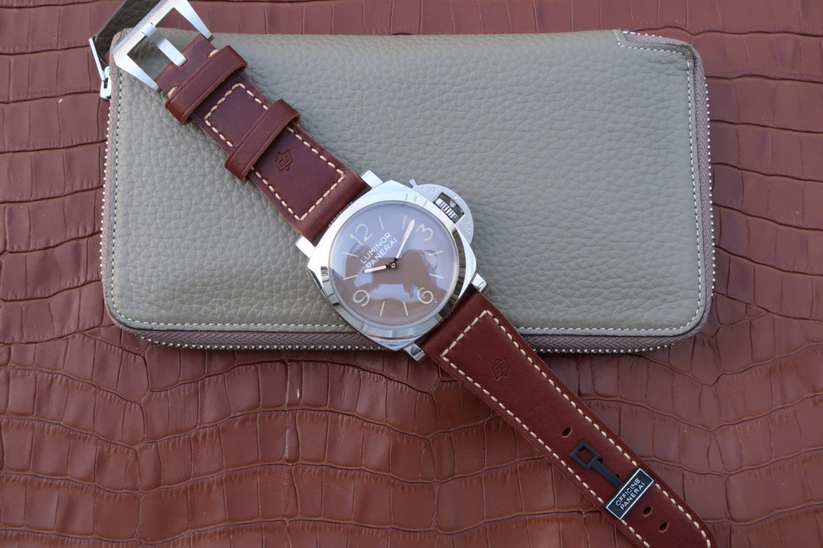Genuine Leather Strap equipped with Stainless Steel V Buckle with Panerai Markings/Engravings. Flush Lug Screws